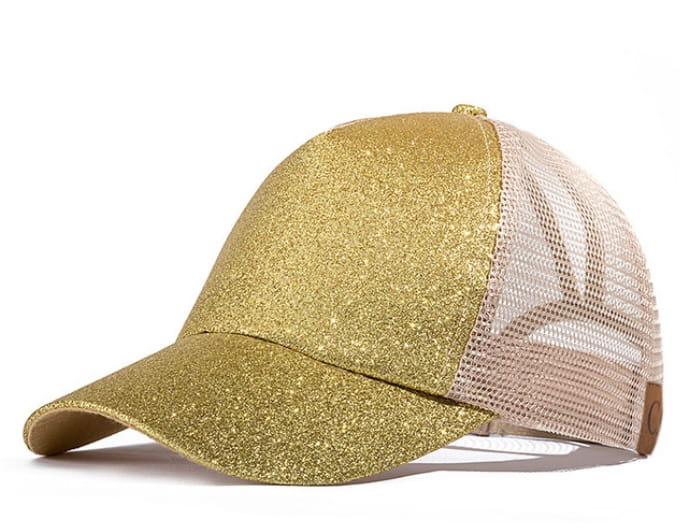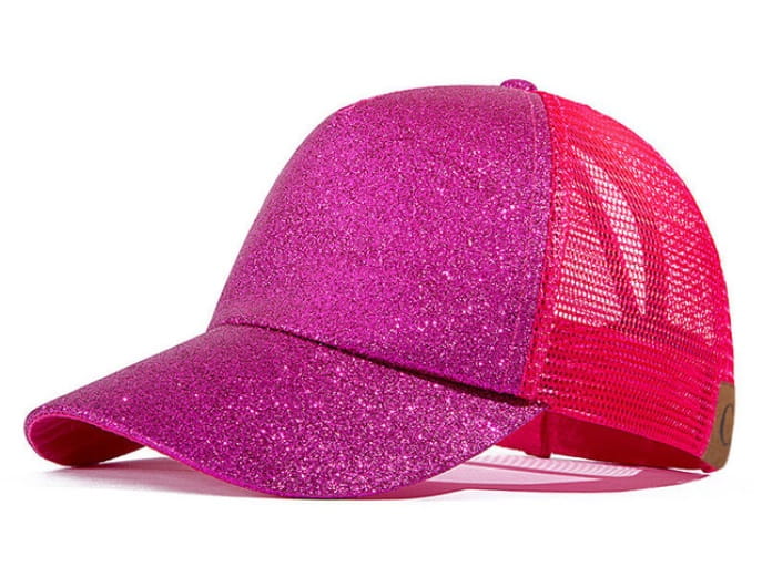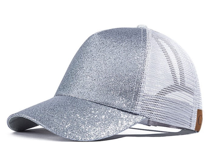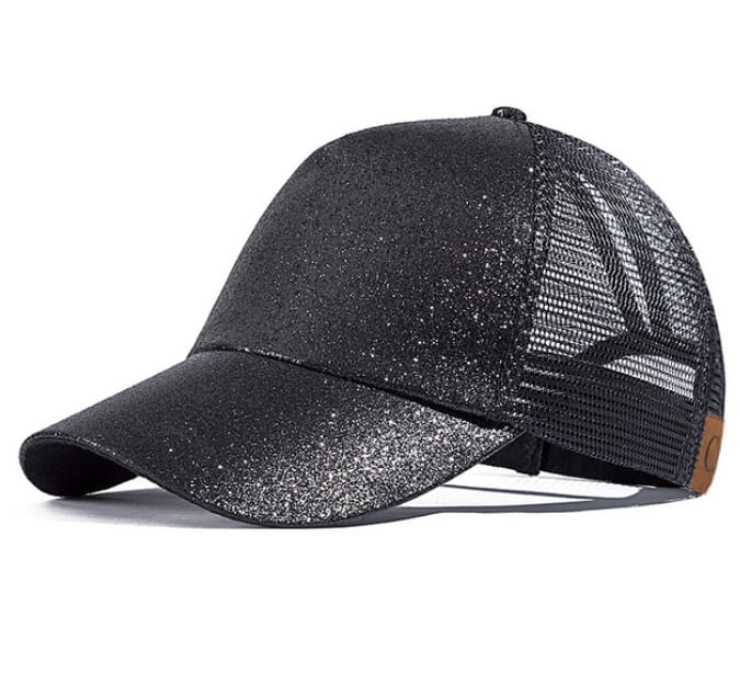 Piękna i bardzo modna w tym sezonie czapka z daszkiem z drobinkami mieniącego się brokatu.