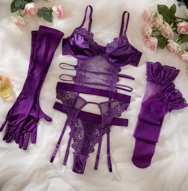 Całość wykonana została z elastycznej koronki i satynowego materiału, dzięki czemu komplet jest wygodny i dopasowuje się do ciała. To idealna propozycja na romantyczne chwile, prezent dla ukochanej albo dodatek do garderoby, który sprawi, że poczujesz się wyjątkowo kobieco i odważnie. Intensywny fiolet sprawia, że bielizna wyróżnia się i przyciąga spojrzenia.