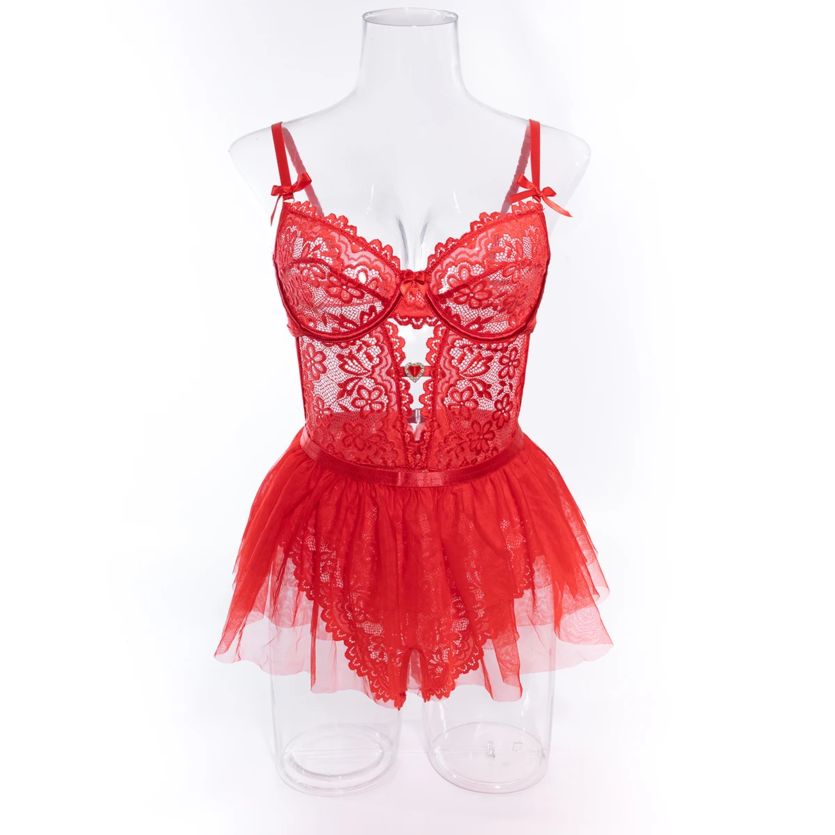 Zachęcamy do odkrycia swojej strony seksualnej dzięki czerwonemu koronkowemu body z otwartym krokiem i tiulową spódniczką, które ożywiają intymne chwile i pozwalają wyrazić swoją wyjątkowość.