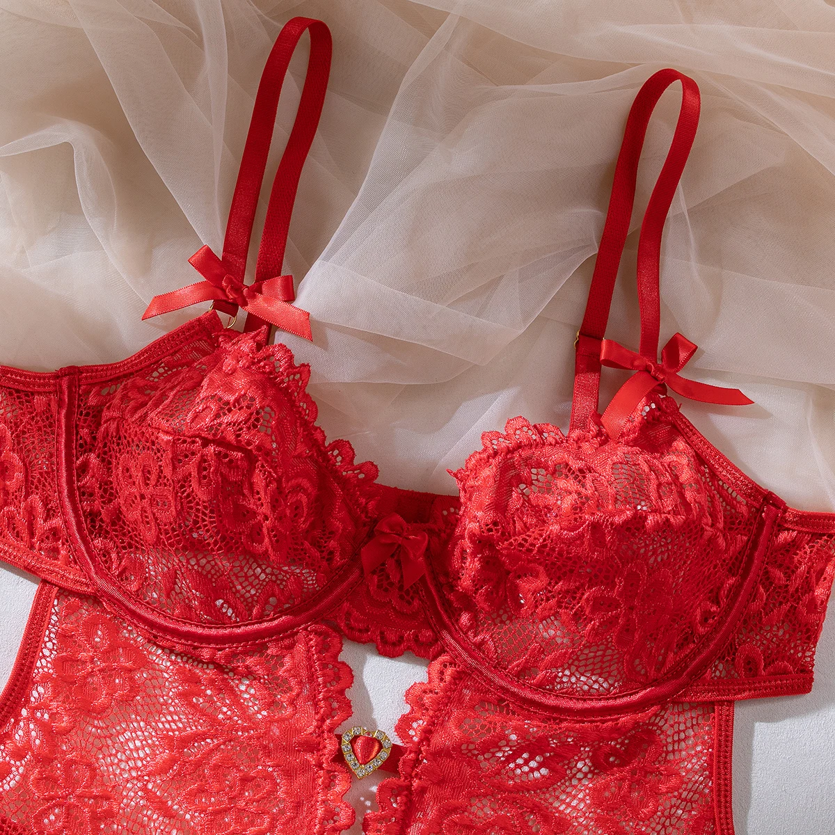 Czerwony kolor dodaje temu strojowi zmysłowości i namiętności, idealnie podkreślając kobiecą pewność siebie. Koronkowe body jest ozdobione delikatnymi wstawkami, które dodają mu subtelnego uroku i elegancji. Otwarty krok daje możliwość łatwego dostępu i stwarza możliwość eksploracji nowych intymnych przyjemności.