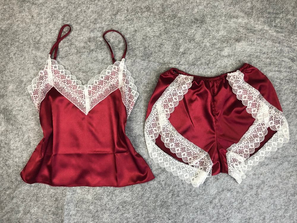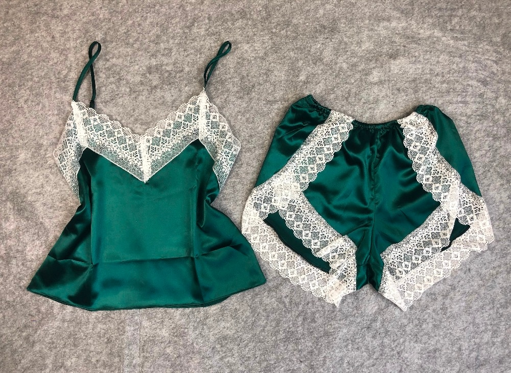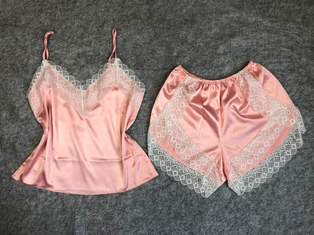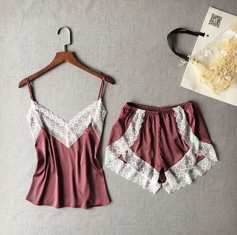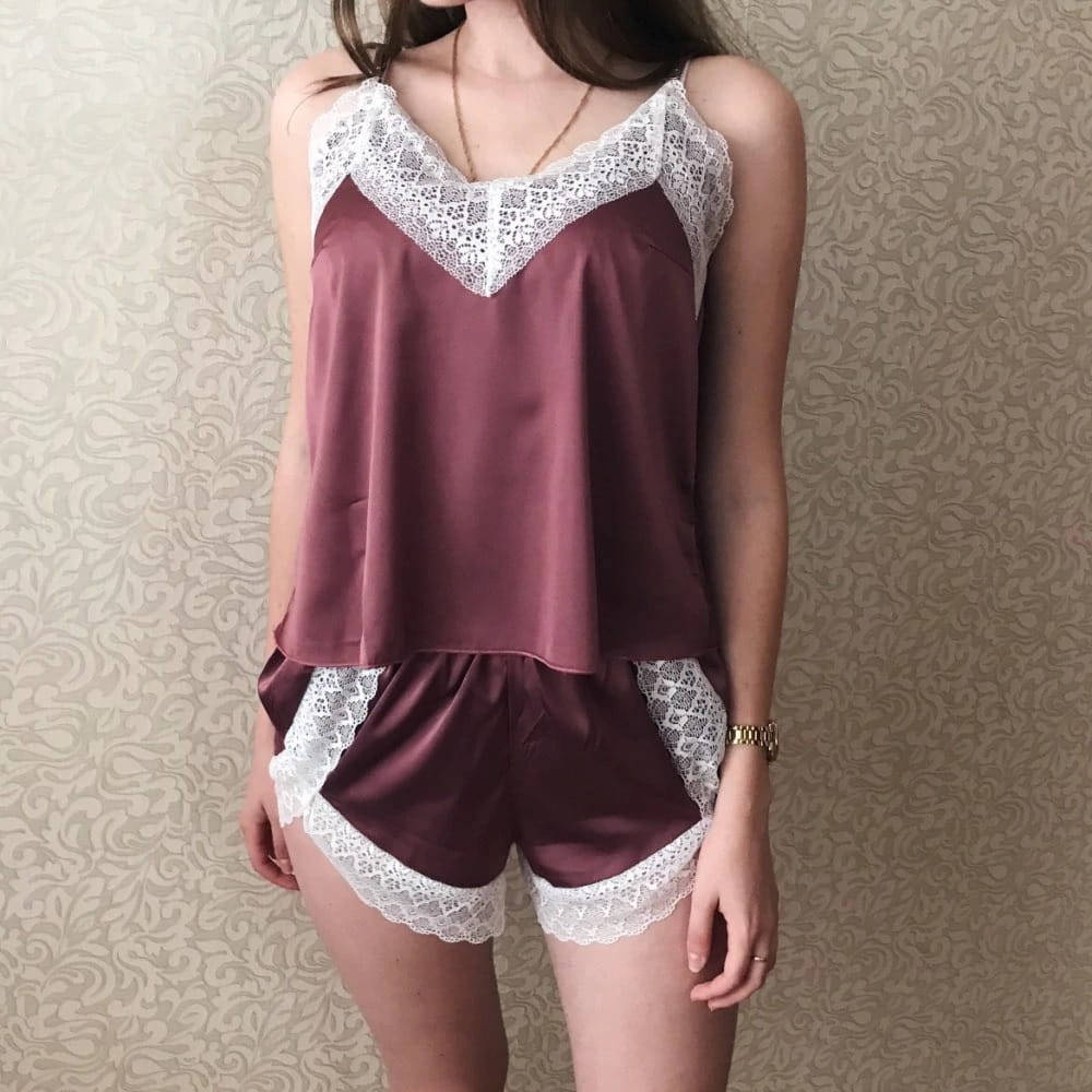 Piękna piżamka satynowa składająca się z topu i krótkich szortów, wykończona koronką.