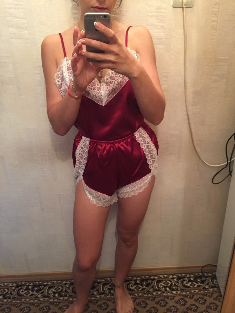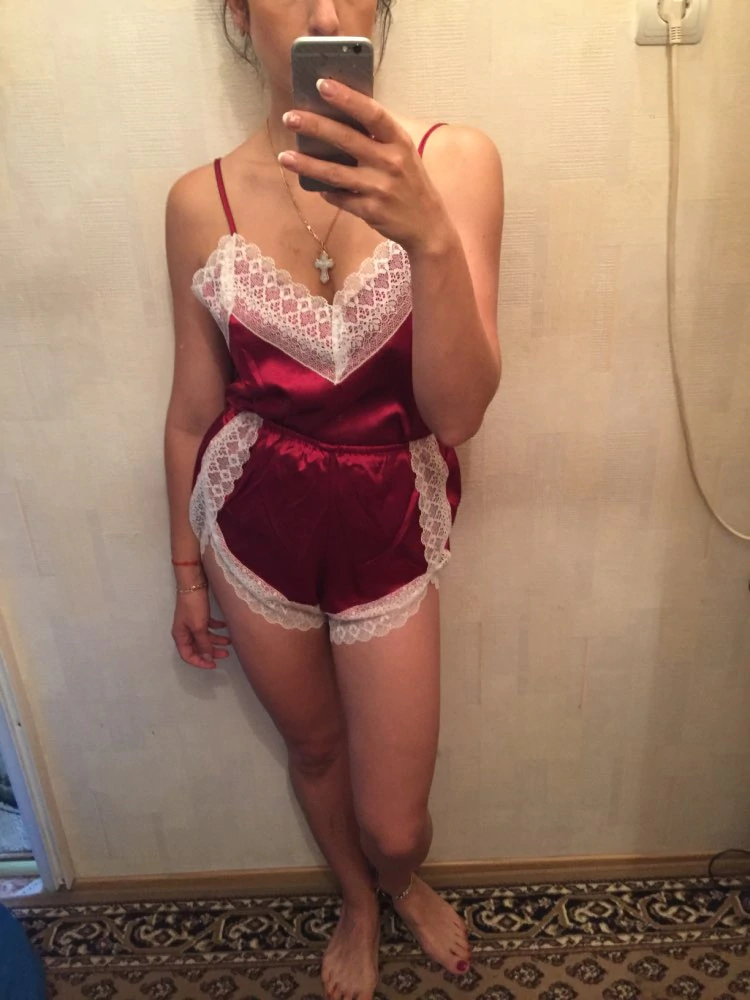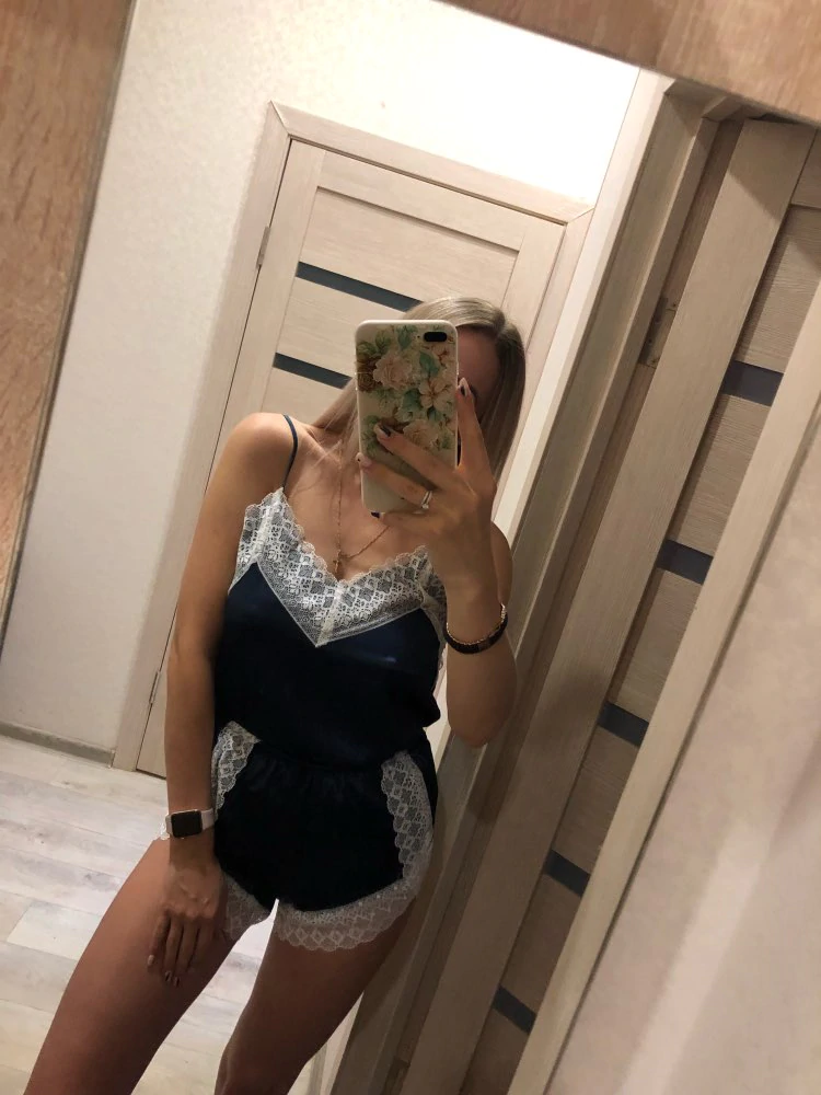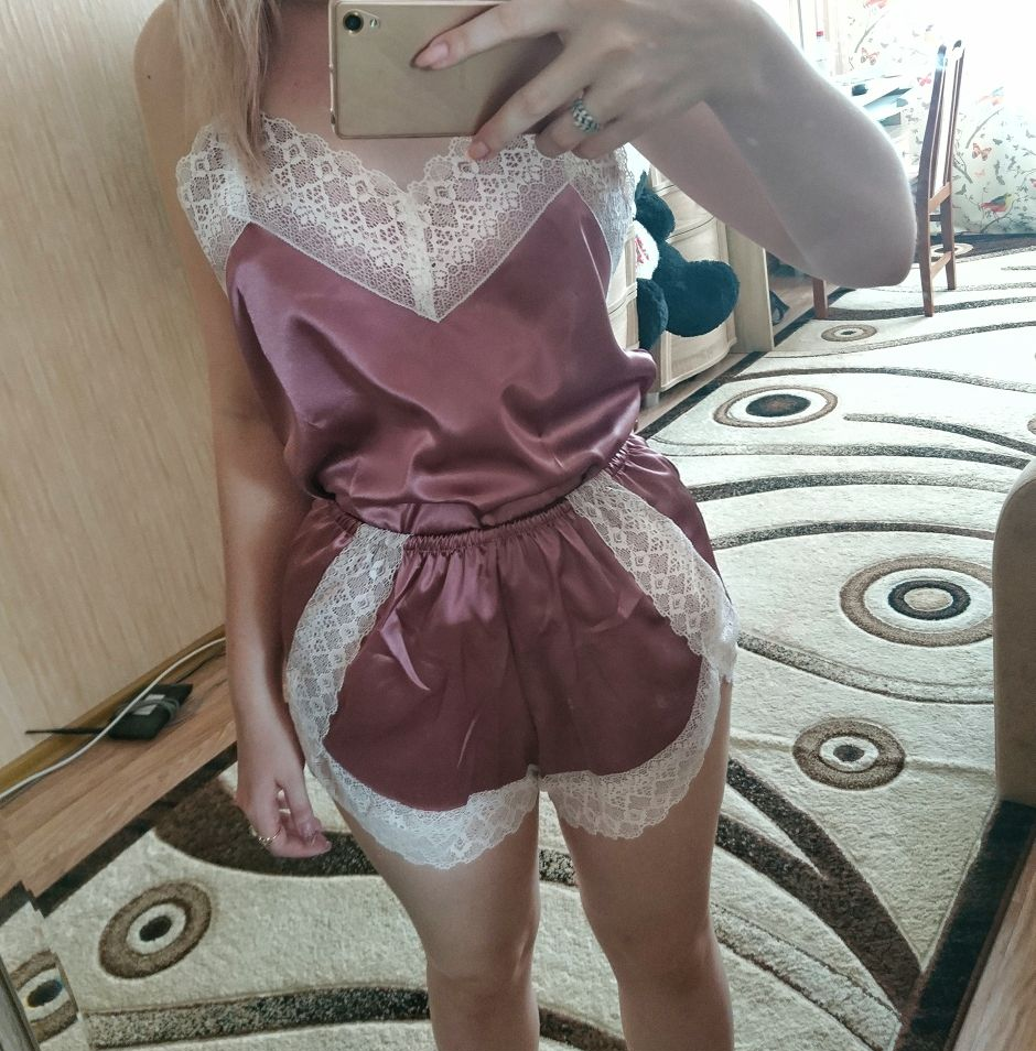 Piękna piżamka satynowa składająca się z topu i krótkich szortów, wykończona koronką.