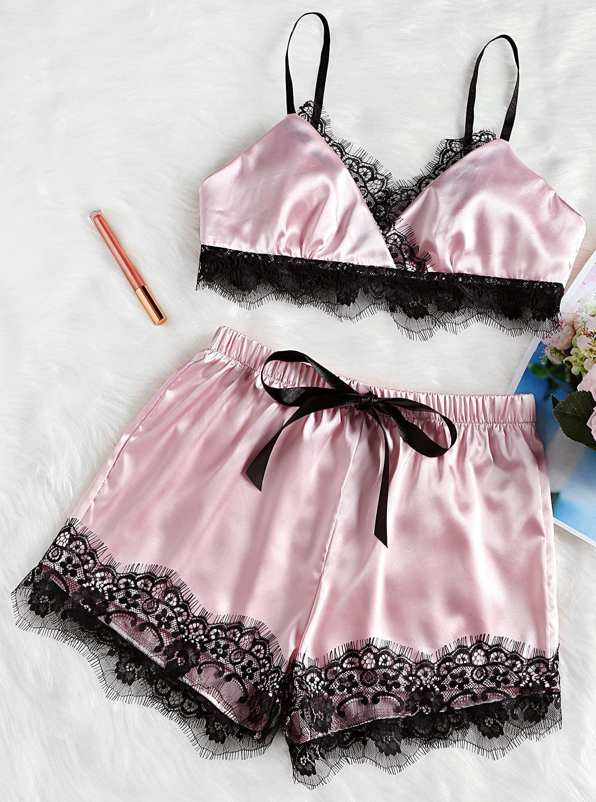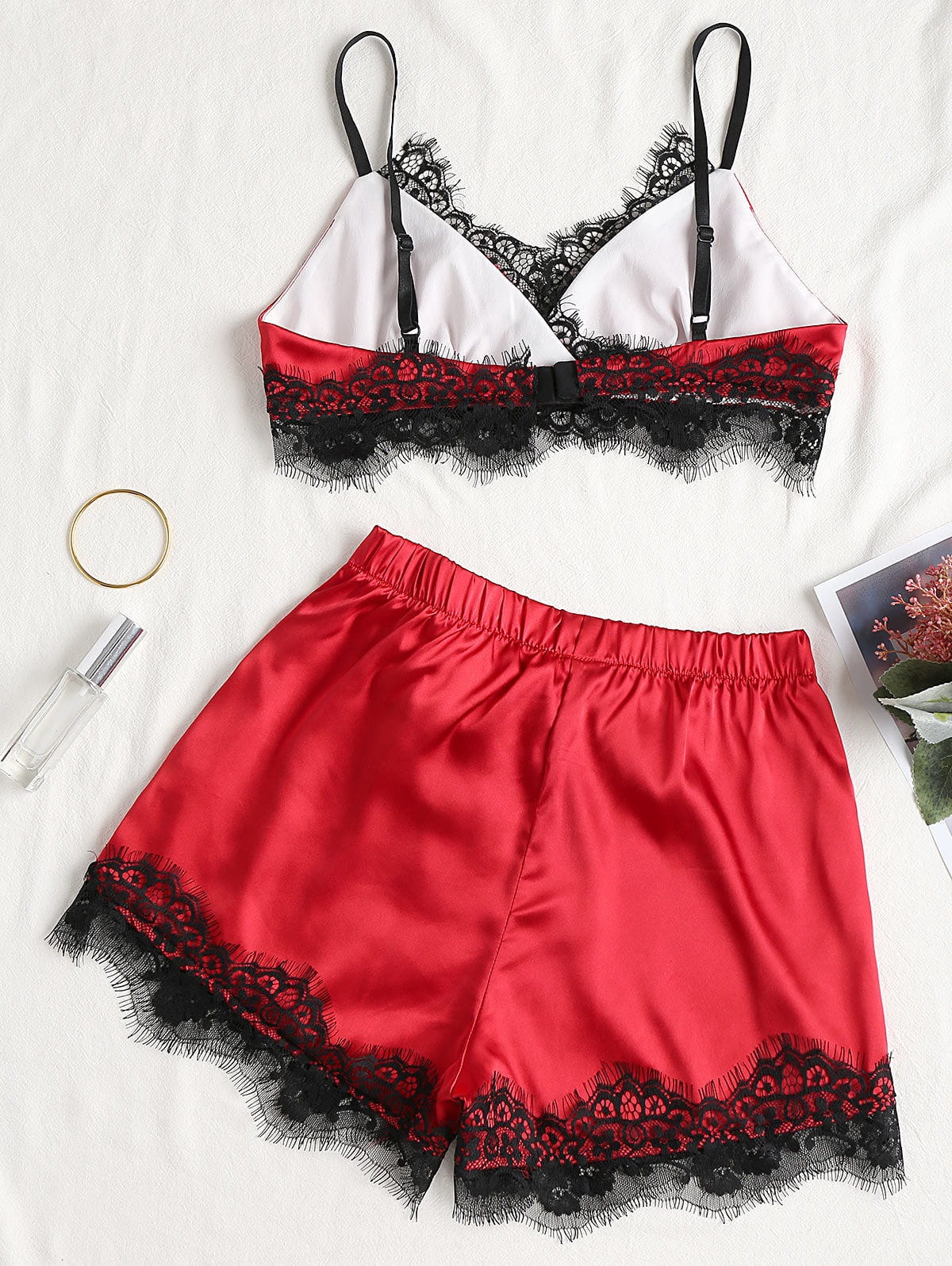 Piżama damska składająca się z biustonosza oraz spodenek zakończonych koronką.