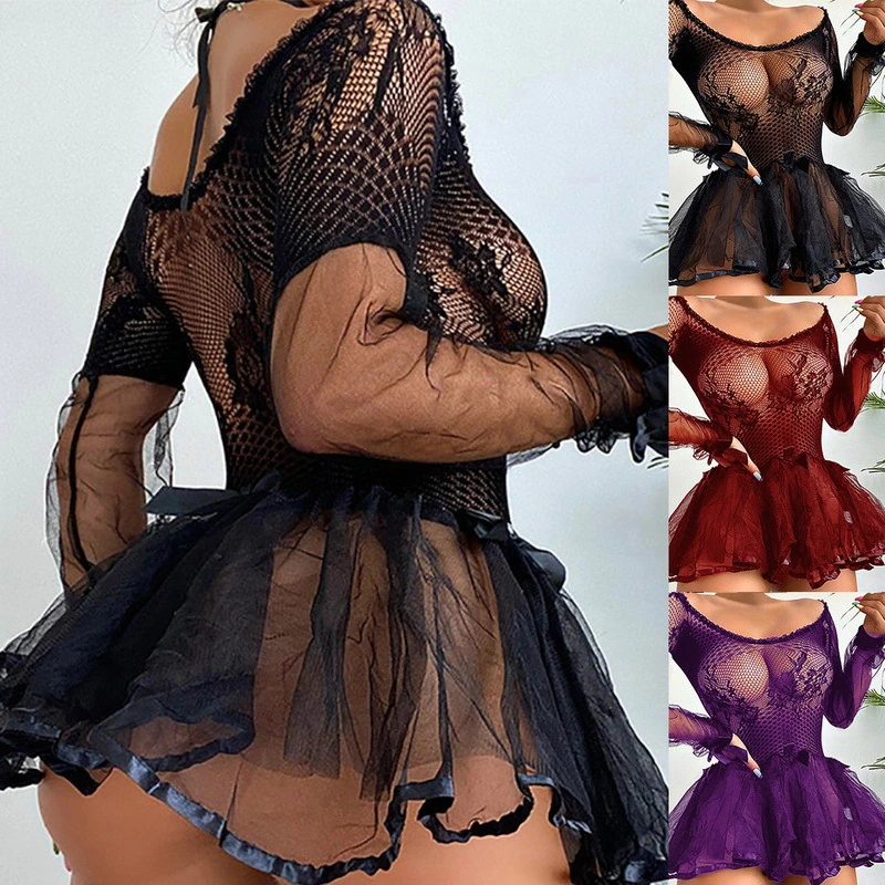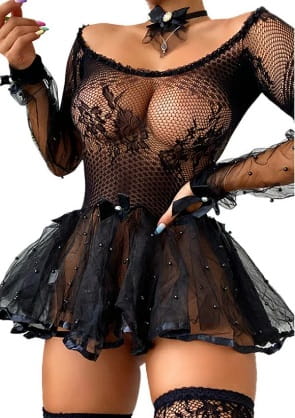 Siatkowa bielizna erotyczna z fikuśną tiulową spódniczką pobudzi wyobraźnie .