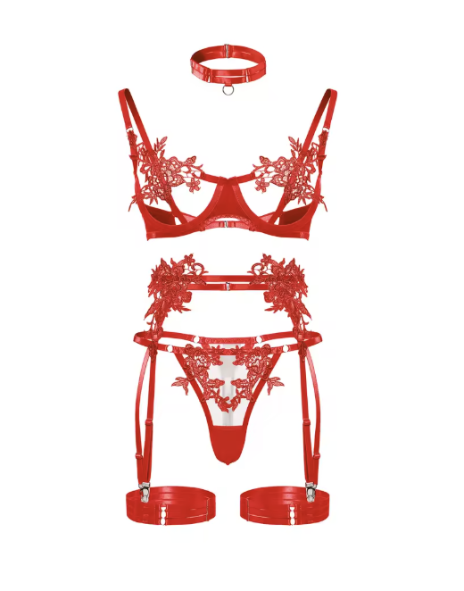 Ten komplet to propozycja dla kobiet, które nie boją się zmysłowej mody. Składa się z aż sześciu elementów: biustonosza z otwartymi miseczkami, stringów, pasa do pończoch, dwóch pasków na uda i ozdobnej obroży. Całość wykonana z miękkiej koronki i elastycznych pasków, które idealnie dopasowują się do ciała i podkreślają sylwetkę.