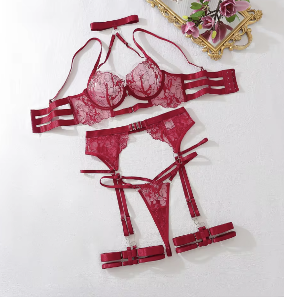 Seksowny komplet bielizny z koronką i paskami – czerwony lub czarny