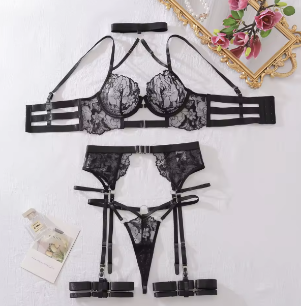 Zmysłowy, trzyczęściowy komplet bielizny z kwiatową koronką, regulowanymi paskami i dodatkowymi zdobieniami w stylu bondage. Idealnie dopasowuje się do ciała, podkreślając biust, talię i biodra. Biustonosz z fiszbinami unosi piersi, a pas do pończoch i opaski na uda dodają całości wyjątkowego charakteru.
