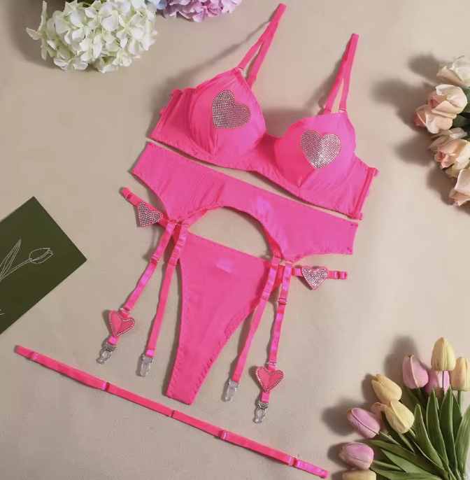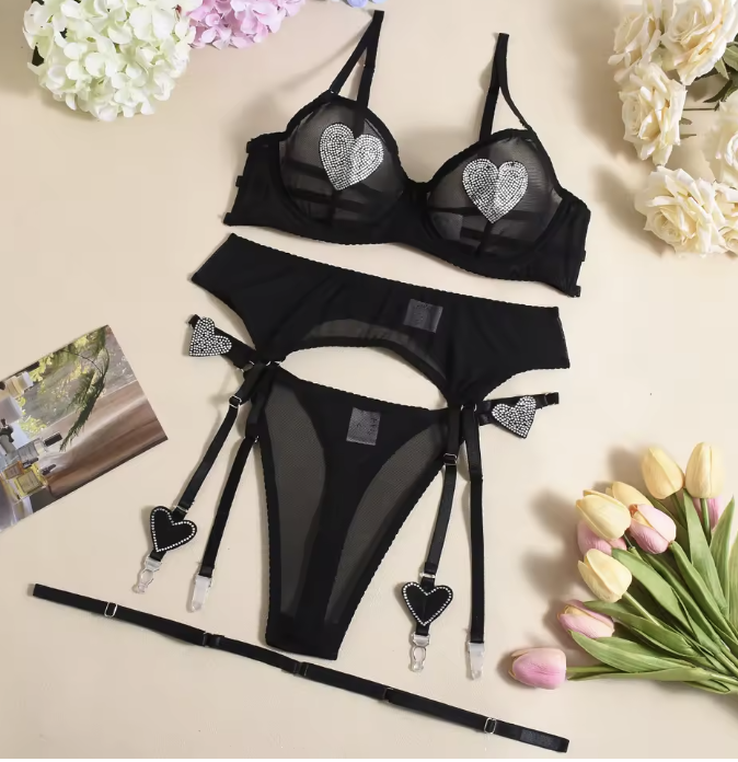 Ten trzyczęściowy komplet bielizny to połączenie stylu, odwagi i błysku. Wyróżnia się serduszkami z cyrkonii umieszczonymi na biuście, biodrach i pasie do pończoch. Jest idealny dla kobiet, które lubią zmysłową bieliznę i chcą zrobić wrażenie.
