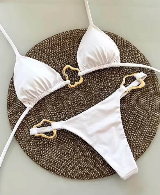 Dolna część to majtki w kroju brazylijskim, który doskonale podkreśla kształty pośladków, optycznie wysmukla sylwetkę i pozwala czuć się pewnie na plaży. Złote ozdoby na biodrach harmonijnie komponują się z ozdobami na górze, tworząc spójną i elegancką całość.
