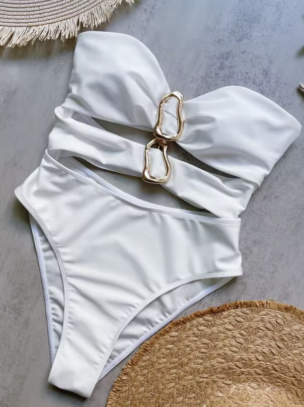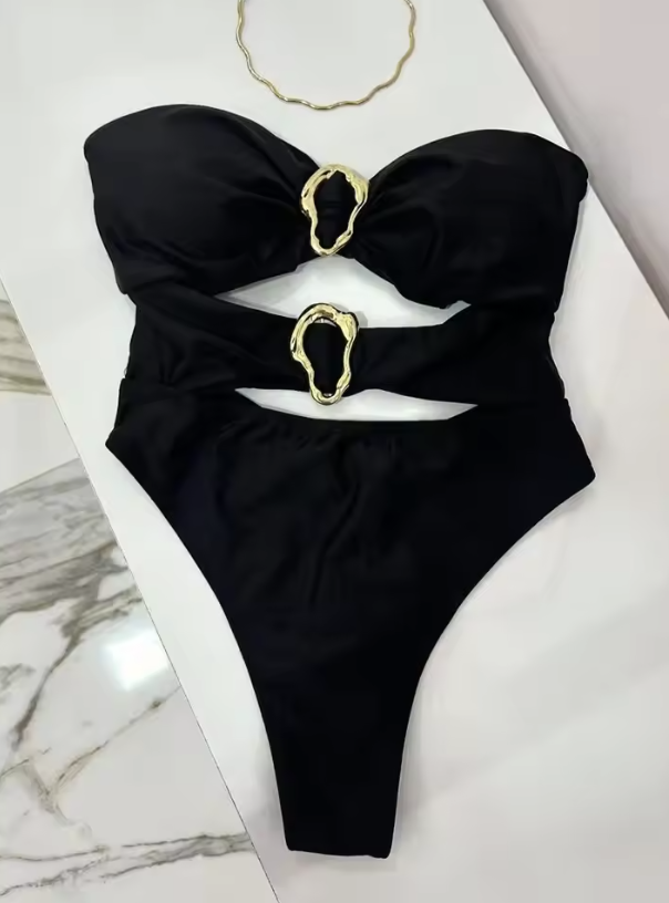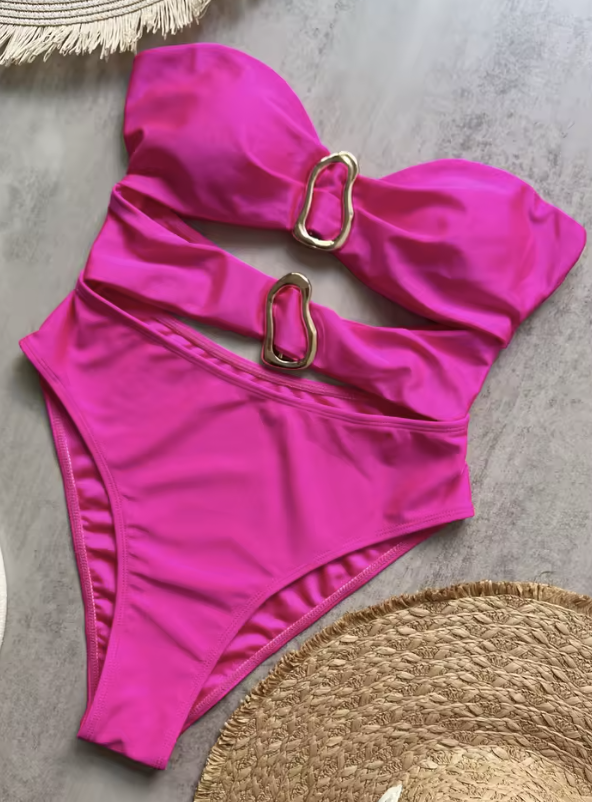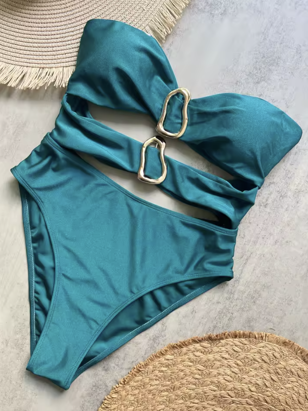 Odkryj zmysłową elegancję z jednoczęściowym strojem kąpielowym! Ten seksowny kostium został zaprojektowany, aby podkreślić Twoje kobiece kształty i zapewnić Ci maksymalną pewność siebie na plaży czy przy basenie. Wycięty na brzuchu, subtelnie eksponuje sylwetkę, dodając odrobiny odważnego charakteru. Metalowe pierścienie w strategicznych miejscach dodają mu wyjątkowego, nowoczesnego stylu. Stroje z wysokim stanem gwarantują komfort i optymalne podkreślenie talii. Idealny wybór dla kobiet pragnących wyglądać seksownie i modnie podczas letnich dni.