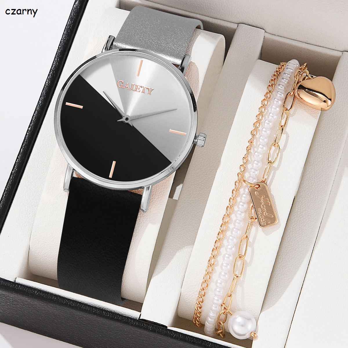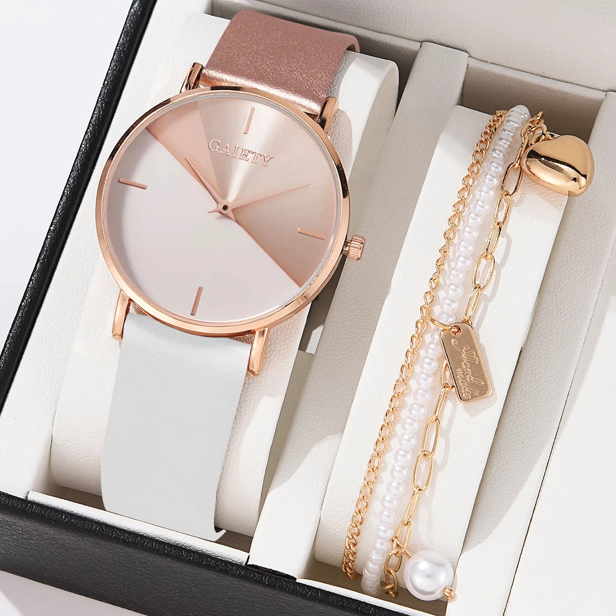 Przepiekny zestaw dla kobiet skladajacy sie z eleganckiego zegarka i potrojnej bransoletki.