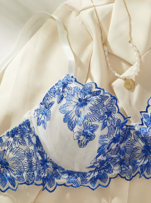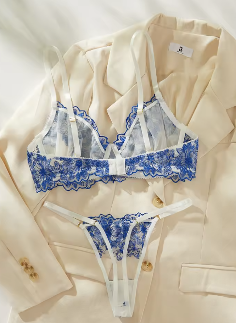 Zmysłowy komplet bielizny z haftem – niebieskie kwiaty na delikatnym tiulu